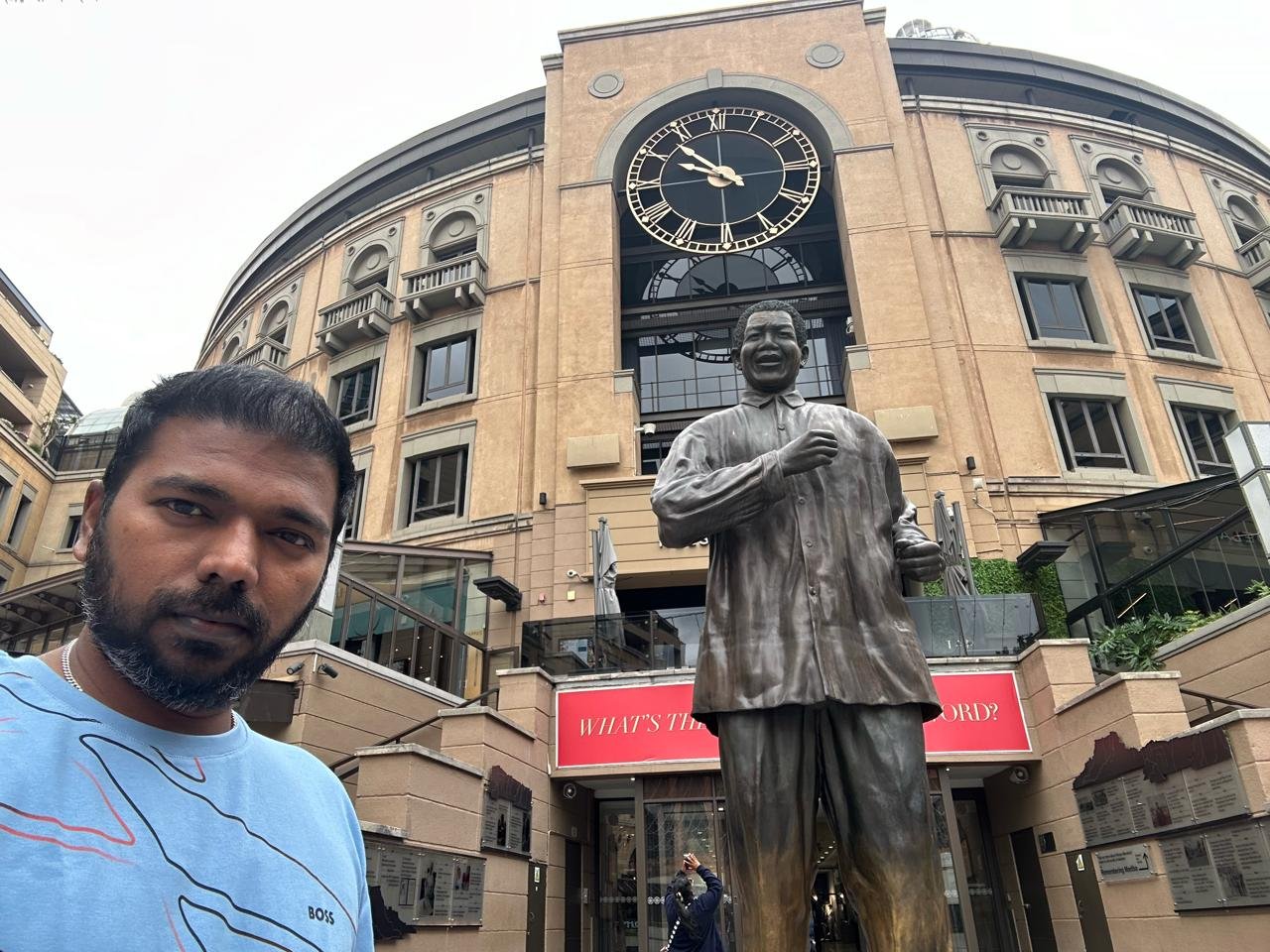 In this photo, I’m standing in front of the iconic Nelson Mandela statue at Nelson Mandela Square in Sandton, Johannesburg. This bustling area is not only a major business district but also a vibrant social and cultural hub. The statue, erected in 2004, honors South Africa’s beloved leader and Nobel Peace Prize winner, Nelson Mandela. It stands as a powerful symbol of peace, freedom, and the enduring spirit of the South African people. The square is surrounded by upscale shops, restaurants, and cafes, making it a perfect spot to experience the city’s modern and dynamic atmosphere.