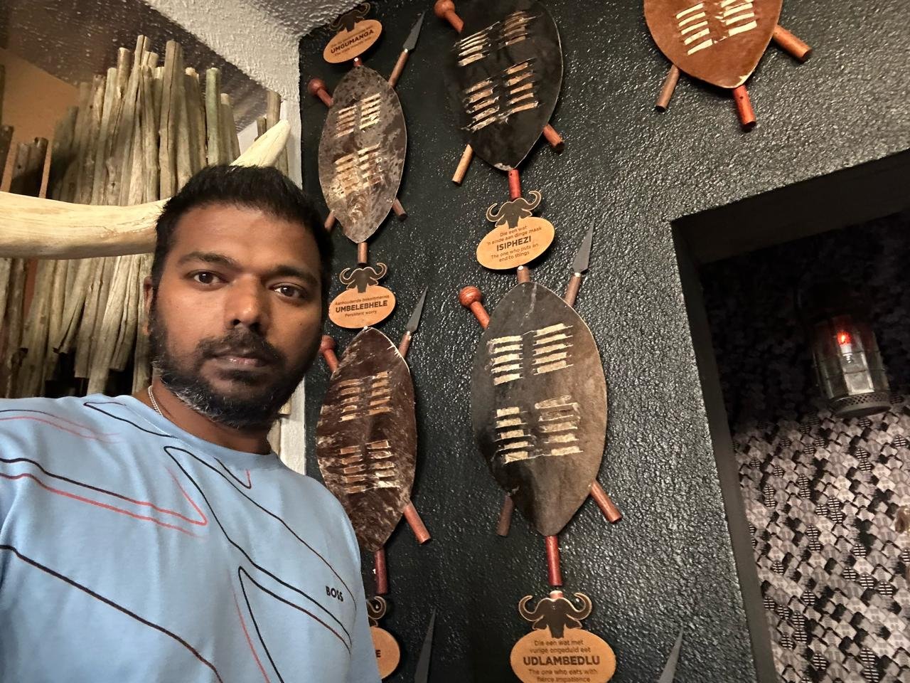 This photo captures my visit to the Shaka Zulu Restaurant in Johannesburg. The restaurant’s decor is inspired by the Zulu culture, one of the largest ethnic groups in South Africa. The shields on the wall, labeled with different names, represent traditional Zulu weapons used by warriors. Shaka Zulu was a formidable leader and founder of the Zulu Kingdom, known for his military innovations and unification of various clans in the early 19th century. Dining here offers not only a taste of traditional Zulu cuisine but also an immersive cultural experience.