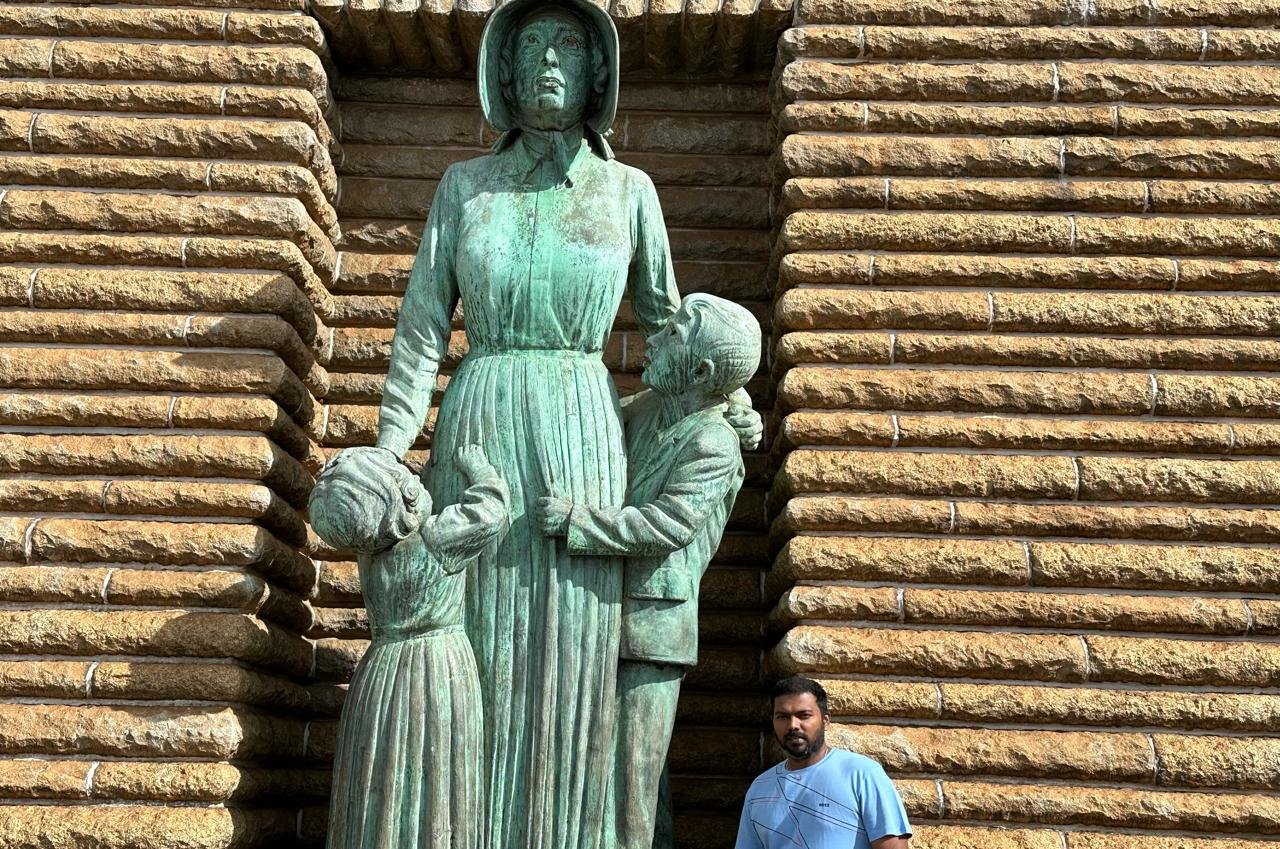 This image shows me standing next to the Women’s Monument at the Voortrekker Monument site in Pretoria. The monument honors the women and children who suffered and perished during the Anglo-Boer Wars. It features a touching sculpture of a woman and her children, symbolizing the resilience and sacrifice of the Boer families. The monument is a testament to the strength and endurance of women during times of conflict and is a vital part of South Africa’s historical narrative.