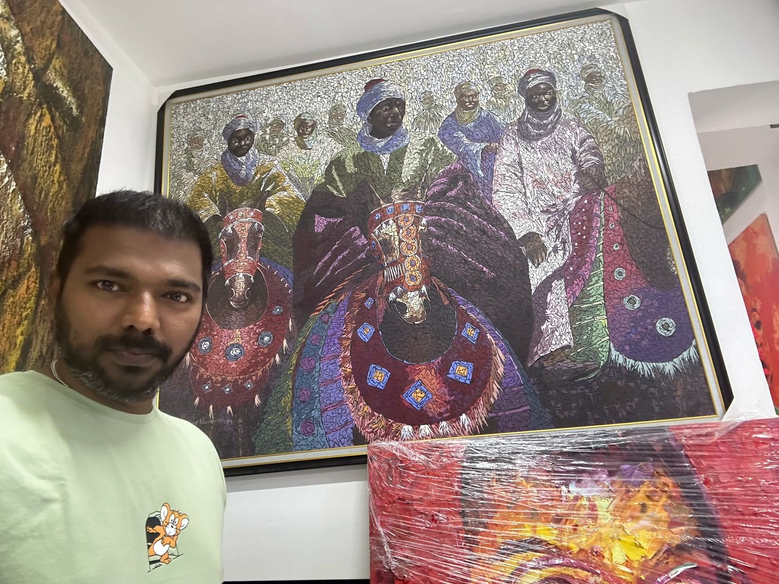 The second photo captures me with another stunning piece of art behind me. This painting portrays individuals adorned in traditional Nigerian attire, mounted on horses, signifying a grand procession or ceremony. The intricate detailing and use of vivid colors highlight the significance of such events in Nigerian culture. These artistic expressions offer a window into the traditional ceremonies and the importance of heritage in Nigerian society.