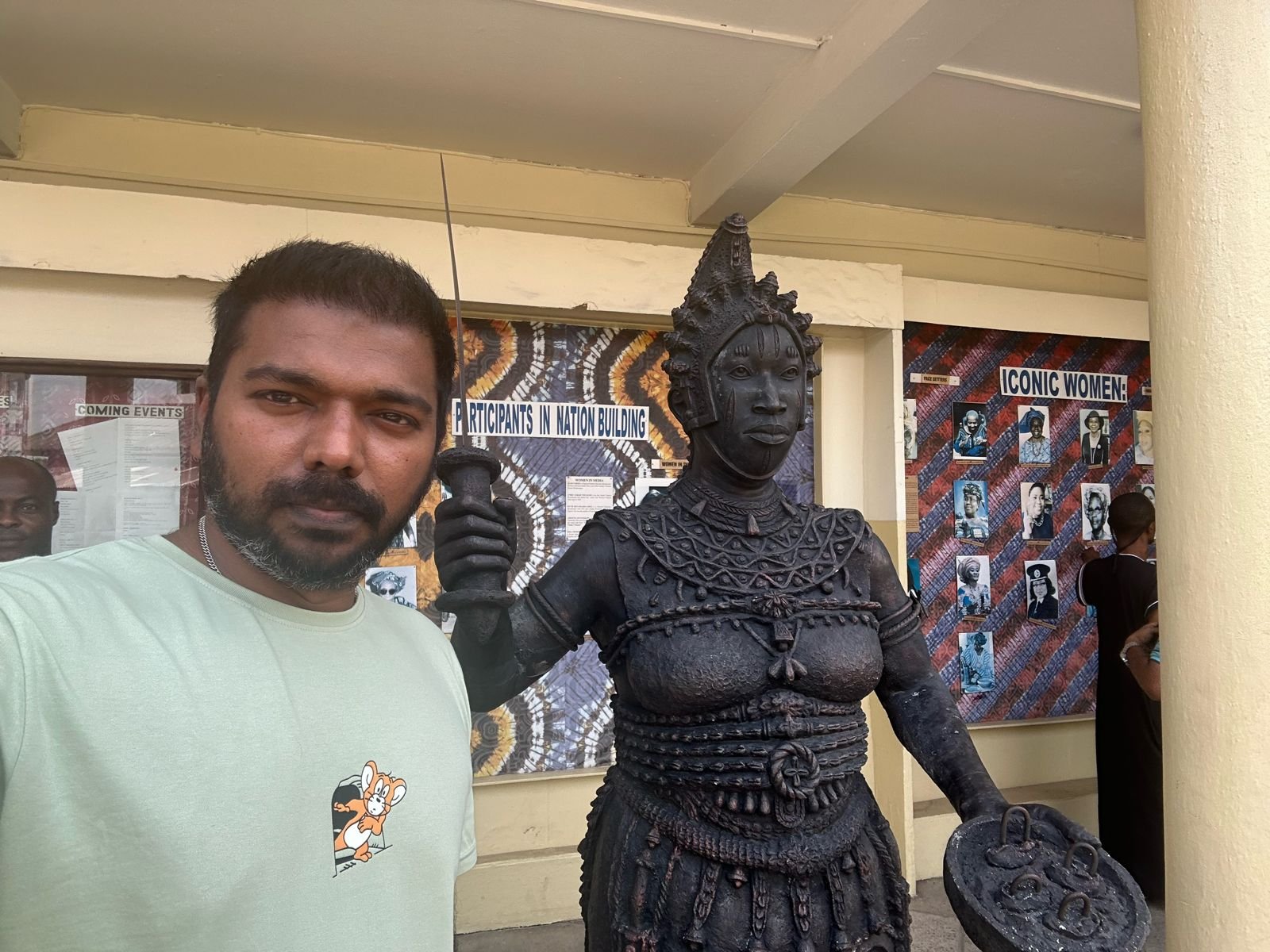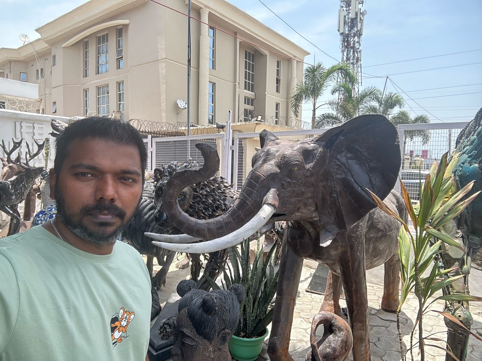 In the third photo, I am surrounded by an array of African sculptures. These wooden artifacts represent various figures and deities, each telling a story of its own. The craftsmanship involved in creating these sculptures is awe-inspiring, reflecting the skills passed down through generations. Visiting this collection allowed me to appreciate the depth of Nigerian heritage and the artistic prowess of its people.