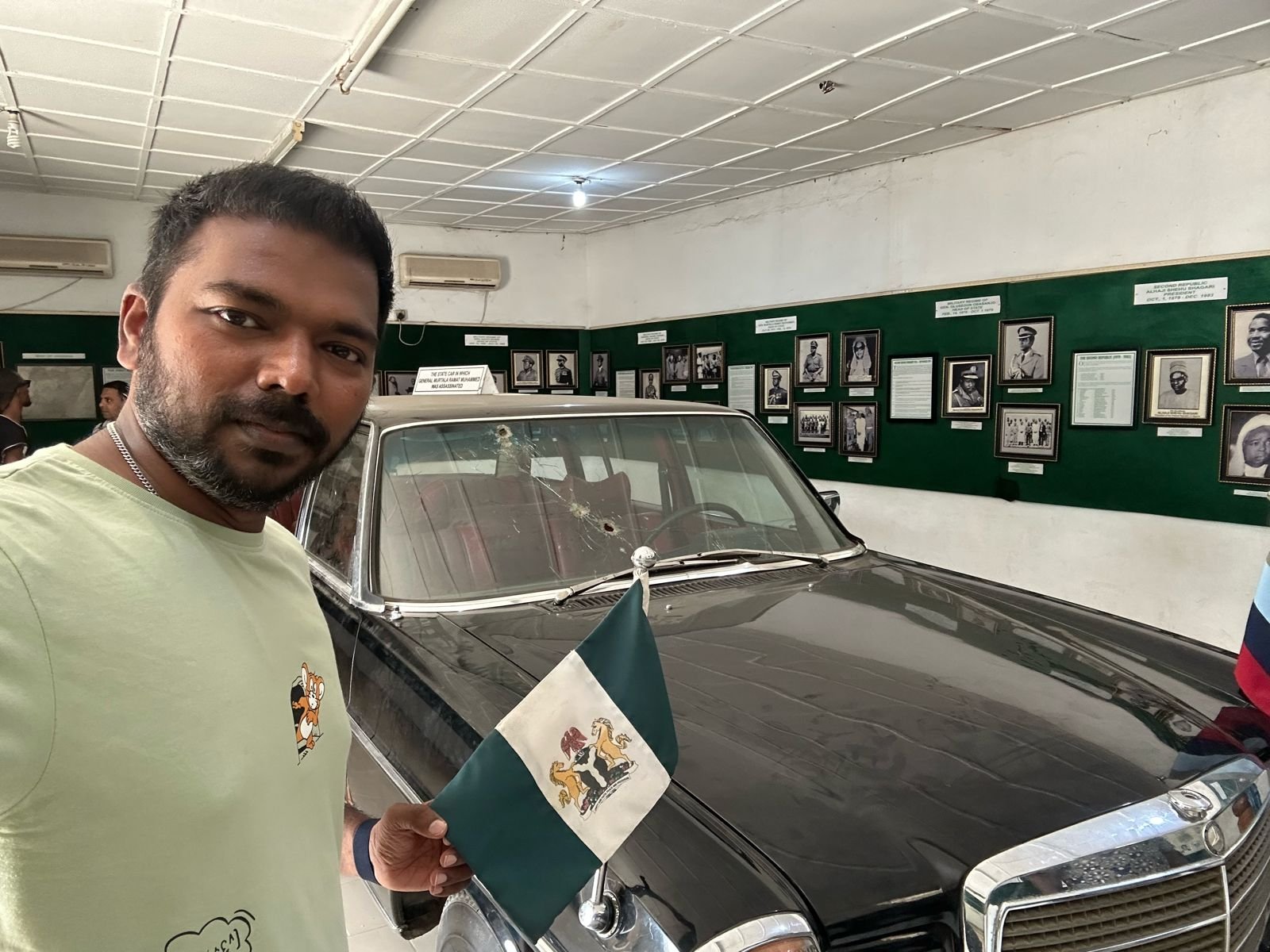 The fourth image shows me at a museum standing next to a classic car that once belonged to a prominent Nigerian figure. The bullet-ridden car is a poignant reminder of the country’s turbulent past and the struggles endured by its leaders. The museum walls are adorned with photographs and documents that narrate the rich history of Nigeria, providing visitors with a comprehensive understanding of the nation’s journey through time.